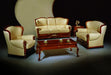 This living room set has an inviting appeal and comfort. Sofa, Loveseat and Chair are accented with wood framing and wrapped in finest genuine Italian leather. Variety of colors available for special ordering.
