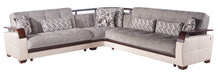 A playful contemporary design and oversized features make the Natural Sectional a perfect fit for the heart of the home. This modern piece features raised wood armrests with chrome detailing, a leatherette exterior paired with a soft velvety interior, and an attractive curvy profile. Spacious seating with corner wedges lets you gather with friends and family alike. This sectional features hidden storage beneath its seats for easy organization and two fold-down sleeper beds that offer guests a cozy place to stay the night.