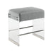 This unique acrylic stool features a larger seating area with a full-size cushioned gray Polyester Fabric upholstered seat with a brushed stainless steel pedestal, footrest and floorplate.
