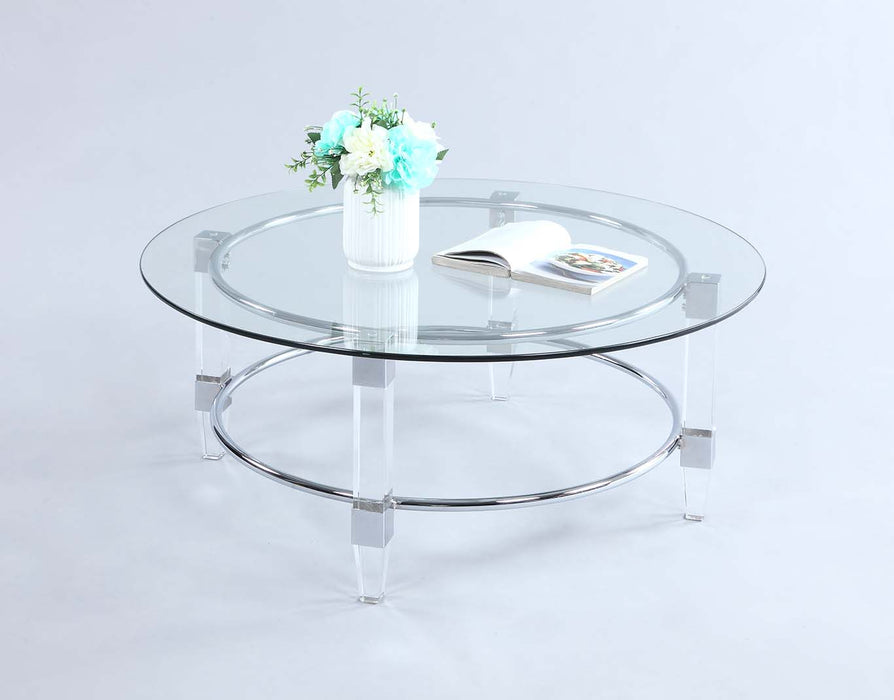 This contemporary cocktail table features a round tempered glass top on a chrome base with thick, solid acrylic legs.