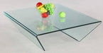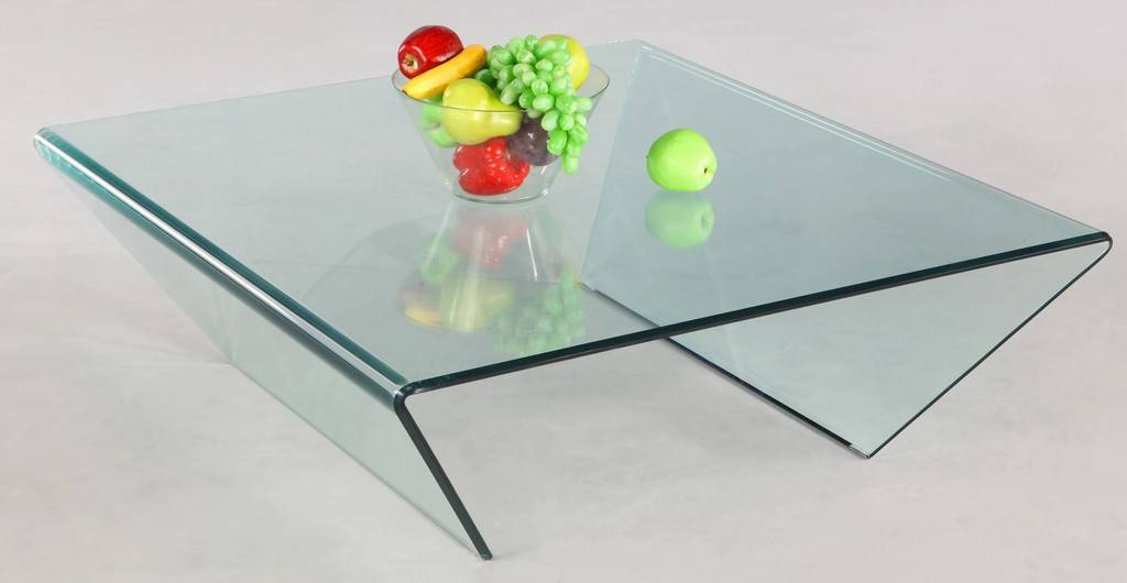 This contemporary, 39" x 41", square cocktail table features a clear bent glass top and angled base. The all glass, 3-sided, prism shape design acts as one flowing, continuous piece.