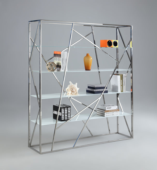 This contemporary bookshelf features 4 white starphire glass shelves measuring 14" x 62" each. An open frame, Art Deco design w/ a polished stainless steel base completes the unit.
