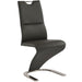 This contemporary handle-back Z-shaped side chair is upholstered top to bottom in faux leather with a brushed nickel finished horseshoe-shaped floor plate.