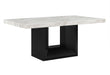 White Faux marble design with extra thick top and a large angle cut wood base. The black upholstered chairs match the base the nail head trim accents the seat and back.
