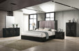 The Rosette Bedroom Set by J&M Furniture brings bold elegance and modern design to your space. Featuring a sleek matte black finish with ribbed accents on the drawer fronts, this set adds texture and sophistication to your bedroom. The bed is upholstered in plush eco-leather, with ribbed accents on the sides. Perfectly combining style and comfort, an integrated LED light on the bed enhances its contemporary appeal.