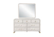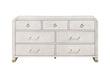 Sophisticated design meets everyday functionality in the Malmo Dresser. Finished in a light beige oak veneer with rounded edges, it features seven spacious drawers, including velvet-lined top drawers ideal for storing jewelry or delicate items. Gold-accented acrylic handles and gold-trimmed legs add a glamorous touch, making this dresser a perfect balance of luxury and practicality.