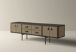 The TRAVELER sideboard is a functional piece with a great design. Divided into three sections, on both sides with two doors and four drawers in the centre. It rests on iron legs that contrast with the warmth of the natural leather that has been used to cover the frame. The hand engraved leather is available in a range of over 40 colours. A high quality eco-leather has been used on the sideboard top to resist the scuffs and scratches to which this area is exposed. Particular attention has been paid to detail to give character to the furniture, with leather straps and corner pieces fixed with pins, reminiscent of typical 1950s travel cases.