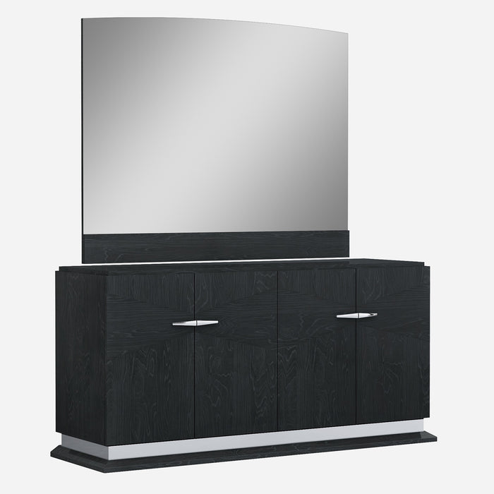 J&M is proud to present The Valentina Premium Dining Room. Crafted from a sophisticated Grey Lacquer high gloss veneer, The Valentina features a luxurious union of Symmetrical lines, chrome accents, and a plush welcoming grey eco pelle upholstered dining chair.