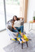 Armchair with a very  attractive design. Curved paddedback. Original swivel system on wooden legs. The matching footstool is  available with or without  cushion, and can be used  as a table. Available only at Fama Stores
